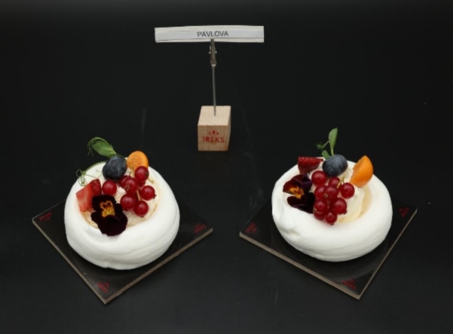 Uygulama: Fırından çıkan pavlova tabanları kuruduktan sonra içerisine parfelenmiş pastacı kreması torba yardımı ile sıkılır ve meyve ile süslenir.